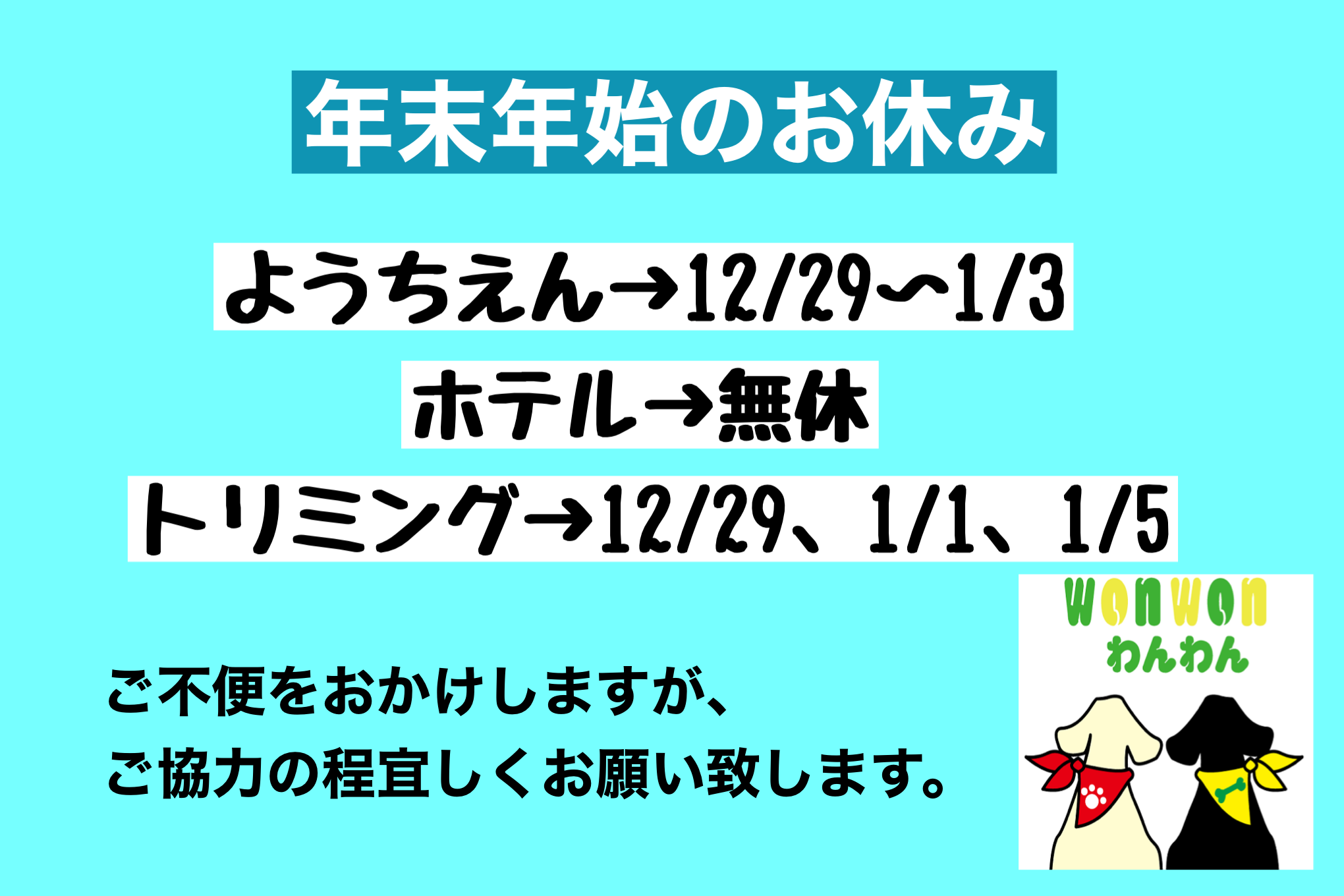 年末年始のお休み 投稿者:wonwonkanri2021年11月14日2021年11月14日カテゴリー:お知らせ 年末年始のお休みのお知らせです。ご用件がある場合は06-6180-6611までお願い致します。 共有: X で共有 (新しいウィンドウで開きます) X Facebook で共有 (新しいウィンドウで開きます) Facebook いいね 読み込み中… 関連